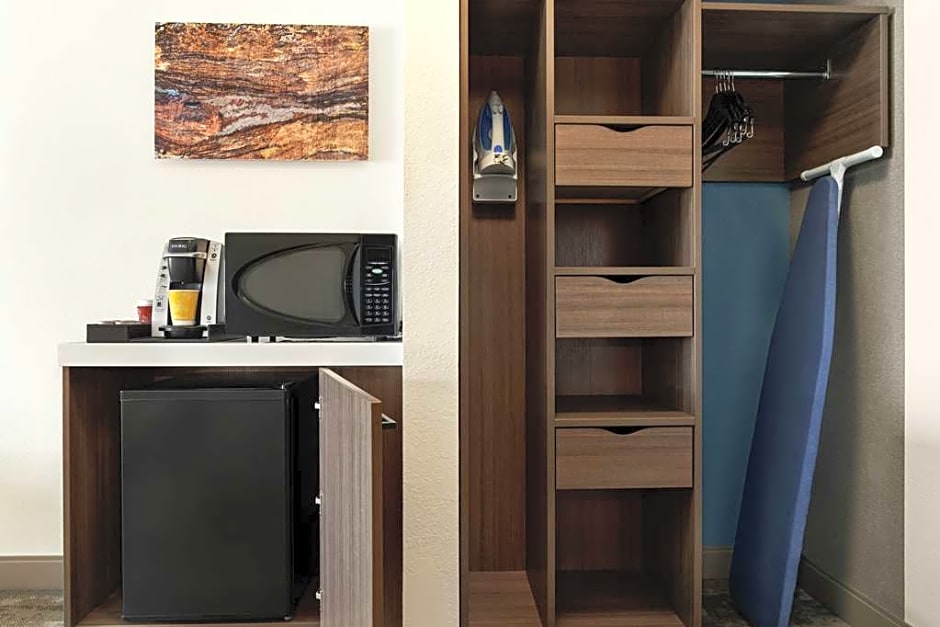 This mobility and hearing accessible standard one bedroom suite features one king-sized bed, and a roll-in shower. The room also has a visual alarm, and notification devices for the doorbell or door knock and incoming telephone calls. Roll-in shower with attached accessible seating, lowered vanity in bathroom, and lowered closet shelf. The pursuit of the perfect night's stay continues with new amenities including the bed, chair and television. The ergonomic Mirra chair by Herman Miller is good for your back and better for work. Enjoy your favorite television on our 48-inch HDTV. There's also a microwave, refrigerator and coffee/tea maker to help you feel at home. Any corresponding photo may not reflect the specific accessible room type or room feature.