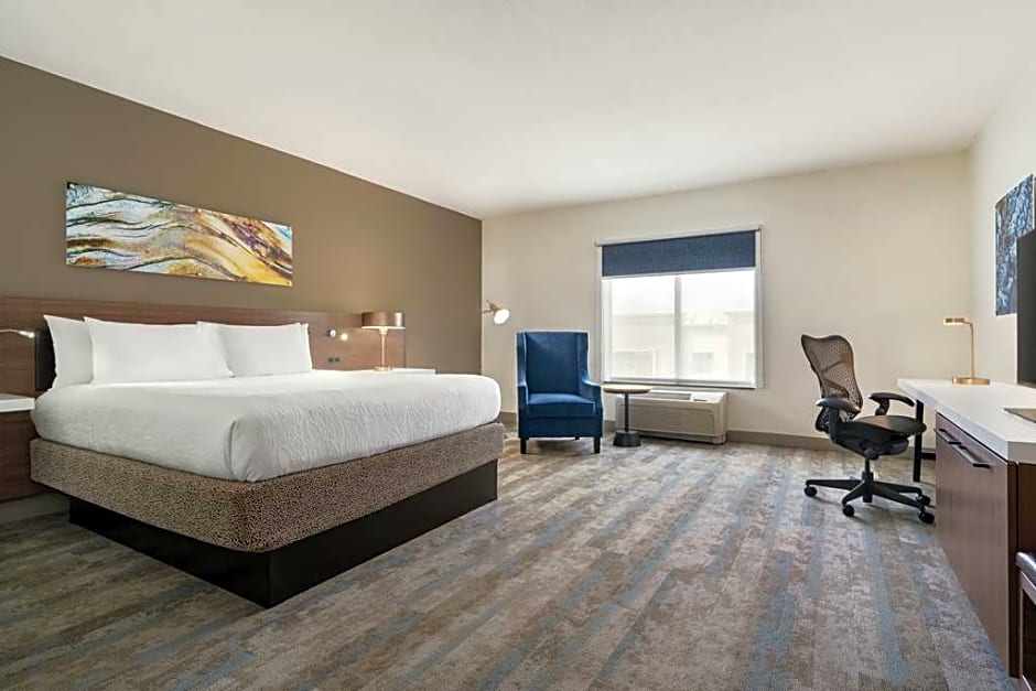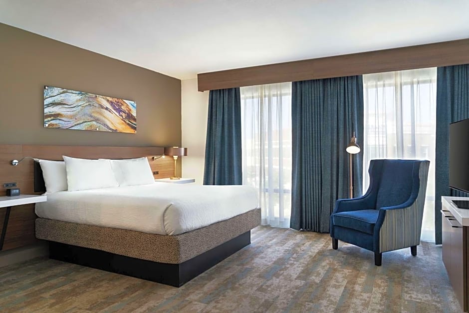 This mobility and hearing accessible standard room features one king-sized bed, and an accessible tub. The room also has a visual alarm, and notification devices for the doorbell or door knock and incoming telephone calls. Grab bar in tub with attached accessible seating, lowered vanity in bathroom, and lowered closet shelf. And the pursuit of the perfect night's stay continues with an evolution of innovative new amenities including the bed, chair, and television. The ergonomic Mirra chair by Herman Miller is good for your back and better for work. Enjoy your favorite television show on our 48 inch high definition television. There's also a microwave, refrigerator and coffee/tea maker to help you feel at home. Any corresponding photo may not reflect the specific accessible room type or room feature.