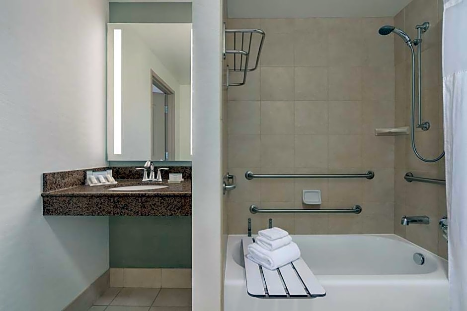 This mobility and hearing accessible standard room features one king-sized bed, and a roll-in shower. The room also has a visual alarm, and notification devices for the doorbell or door knock and incoming telephone calls. Roll-in shower with attached accessible seating, lowered vanity in bathroom, and lowered closet shelf. And the pursuit of the perfect night's stay continues with an evolution of innovative new amenities including the bed, chair and television. The ergonomic Mirra chair by Herman Miller is good for your back and better for work. Enjoy your favorite television show on our 48-inch HDTV. There's also a microwave, refrigerator and coffee/tea maker to help you feel at home. And for conducting business, our rooms ensure your productivity thanks to the spacious work desk. Any corresponding photo may not reflect the specific accessible room type or room feature.